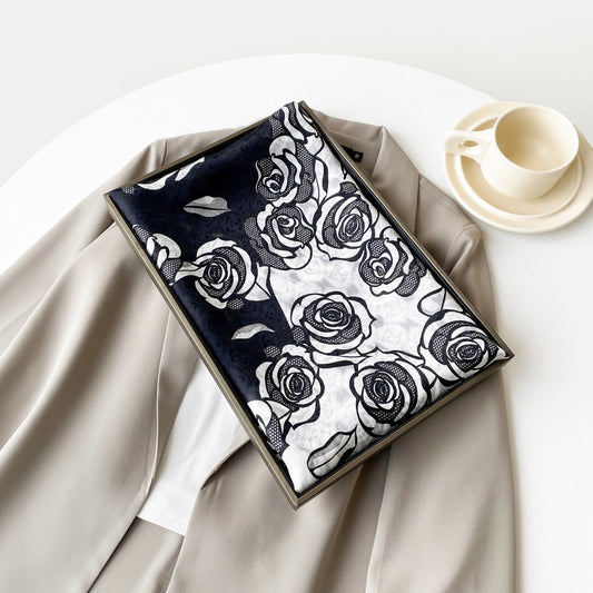 BCHICU ZS25-Black And White Rose 55cm*170cm 100% Silk Shawls